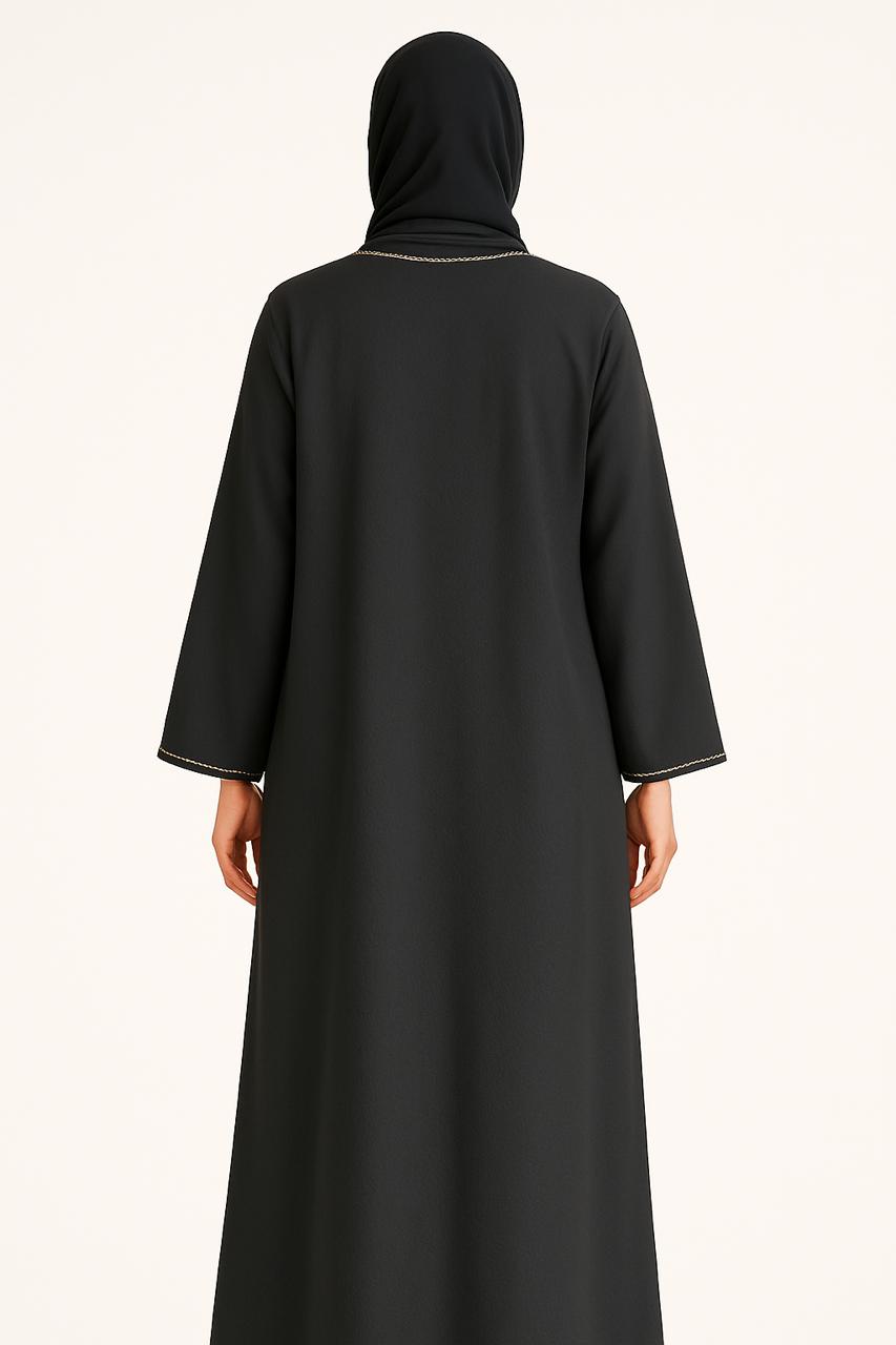 Classic Black Closed Abaya with Elegant Gold Trim Detailing